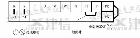 其中端子排上的R、S、T 端子與三相工頻電源連接, U、V、W 端子與電動機連接; P1、P 端子, PR、PX 端子, R、R1 端子和S、S1 端子用短接片連接; 接地端子用螺釘與接地線連接固定。