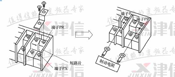 2、PX、PR 端子外接短路片, 將內(nèi)部制動電阻和制動控制器件連接起來。有時,變頻器在高頻度制動內(nèi)置制動電阻時易發(fā)熱, 由于封閉散熱能力不足, 這時需要安裝外接制動電阻來替代內(nèi)置制動電阻。 可將PX、PR 端子之間的短路片取下, 再在P、PR 端外接制動電阻。