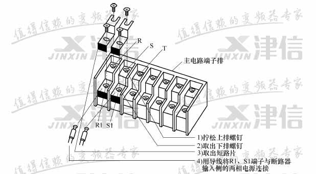 4、R1、S1 端子內(nèi)接控制電路, 外部通過短路片與R、S 端子連接, R、S 端的電源通過短路片由R1、S1 端子提供給控制電路作為電源。如果希望R、S、T 端無工頻電源輸入時控制電路也能工作, 可以取下R、R1 和S、S1 之間的短路片, 將兩相工頻電源直接接R1、S1 端。