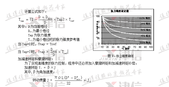 有了當(dāng)前卷徑值,和張力錐度設(shè)定值,就能計(jì)算當(dāng)前張力。張力與卷徑的關(guān)系如圖3所示,當(dāng)張力錐度為0時(shí),張力保持恒定不變,相當(dāng)于恒張力控制;當(dāng)張力錐度為100%時(shí),卷徑每增大1倍,張力就下降一半,相當(dāng)于恒轉(zhuǎn)矩控制。